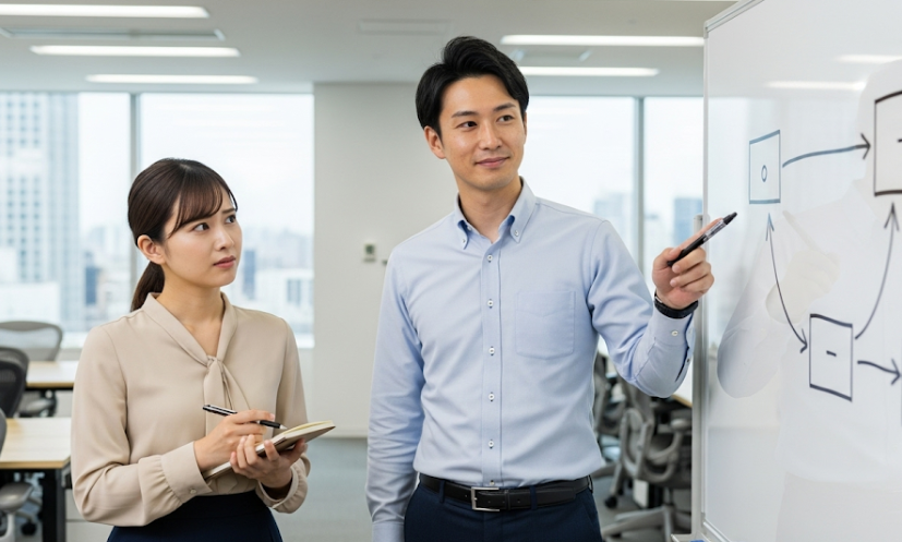 言葉だけで説明するのではなく、ホワイトボードに書き出したり、簡単なメモを見せながら話したりすることで、情報の誤解や抜け漏れを防ぎます。
